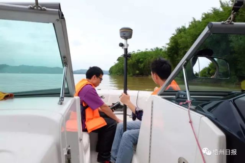5月24日,在潯江梧州段,市測繪地理信息院工作人員對梧州龍舟隊挑戰吉尼斯世界紀錄的水道進行長度測量及現場定位。