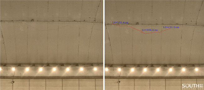 該項目的檢測數據為基礎的成果數據,施工后需要作為再次檢測病害信息對比的依據。結合系統內的里程計參數對應隧道內的柵格影像信息,系統采集到的高清影像能夠明確病害位置,并在圖像拼接過程中保證數據的真實性和可靠性。系統能夠根據隧道斷面圖得出相機至隧道頂部的距離,通過距離分析像素單元距離,從而得出裂縫病害長度,并將檢測采集隧道基本信息、病害數據以及影像資料等形成隧道信息大數據,為隧道運營安全提供堅實的數據保障。