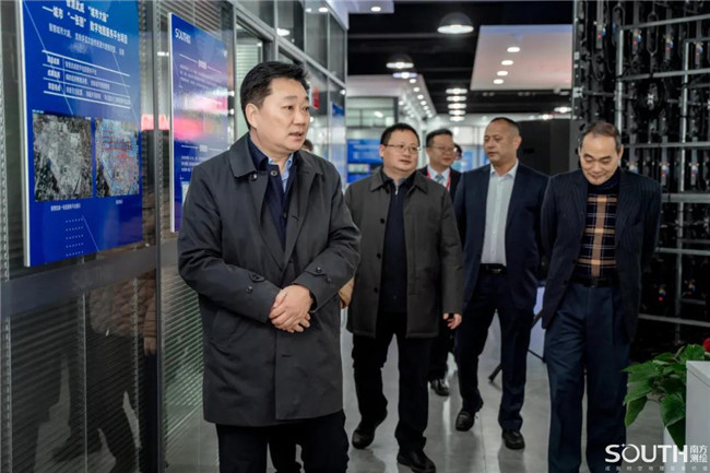 儀式結束后,在馬超和繆小林的陪同下,李傳殿一行參觀了時空大數據中心,詳細了解了中心目前的架構、業務方向和配置等情況,在設備展示區,繆小林對南方測繪在常規和新興測繪裝備、衛星導航定位應用、地理信息應用服務及智慧城市應用等方面的應用成果和技術進展進行了匯報。李傳殿說道,時空大數據中心的揭牌是雙方戰略合作落實的一個良好開端,未來雙方以此為支點,積極推進測繪地理信息科技創新和產業化發展,為自然資源信息化提供更多支撐和保障,繼續落實合建“兩基地一中心”的“兩基地”,積極行動,加大科技創新和產業化實施力度,爭取早日落地成果,為安徽省自然資源信息化及測繪地理信息行業的發展作貢獻。