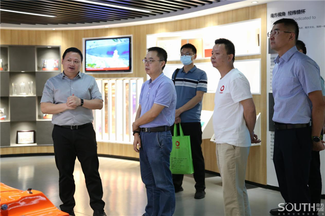 在繆小林等的陪同下,王偉東一行參觀了南方測繪體驗中心,繆小林向來賓詳細介紹了南方測繪的發展歷程、技術裝備和企業文化等內容,雙方結合各自所在領域的技術和業務探索,對南方測繪在智慧物聯服務、地理信息應用服務、數字孿生等方面的技術探索和產業成果進行了簡短交流。