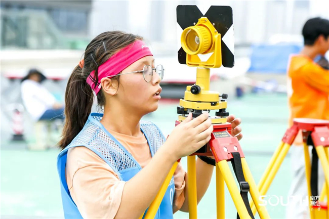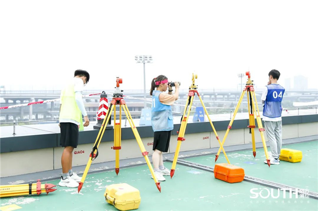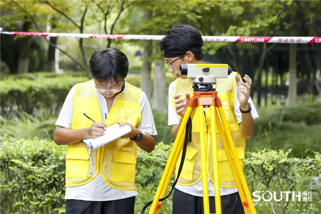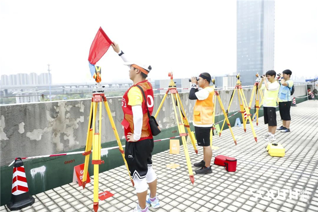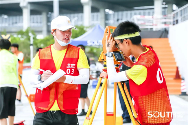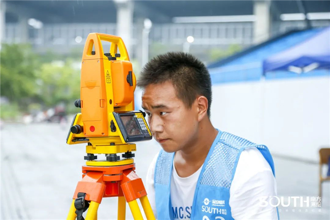 根據賽程安排,8月26-27日兩天的比賽均在上午7:00開始。本次大賽共有兩個賽項,分別是四等水準測量和一級導線測量及單點放樣。兩個賽項分別在學校內劃定的兩個區域內同時進行。賽場上,選手們都在與時間賽跑,爭分奪秒地完成手上的儀器架設和調平。在兩天的比賽中,大賽曾經歷了雷雨天氣,參賽選手們穿上雨衣,眼鏡已經被雨水打濕,手中記錄測量數據的筆卻從未停下。各參賽團隊分工明確,井然有序地完成了一個又一個點位的測量。大賽組委會安排了100余領隊和指導老師、50余名裁判和專家、200余名學校工作人員和志愿者全程陪伴,南方測繪的40余名技術工程師也一直積極做好賽事的保障工作,及時為競賽內容調整儀器的參數,雙方共同保證大賽的順利進行。