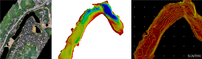 技術(shù)團(tuán)隊(duì)采用了南方SU20無(wú)人船搭載測(cè)深儀測(cè)量水下地形、南方無(wú)人機(jī)掛載傾斜攝影相機(jī)測(cè)量?jī)砂兜匦危?dāng)晚就完成了水下外業(yè)勘測(cè),并于7日上午完成了全部外業(yè)勘測(cè)。內(nèi)業(yè)小組爭(zhēng)分奪秒處理測(cè)量數(shù)據(jù),生產(chǎn)三維實(shí)景模型并繪制兩岸標(biāo)準(zhǔn)地形圖,7日中午輸出了初步成果。