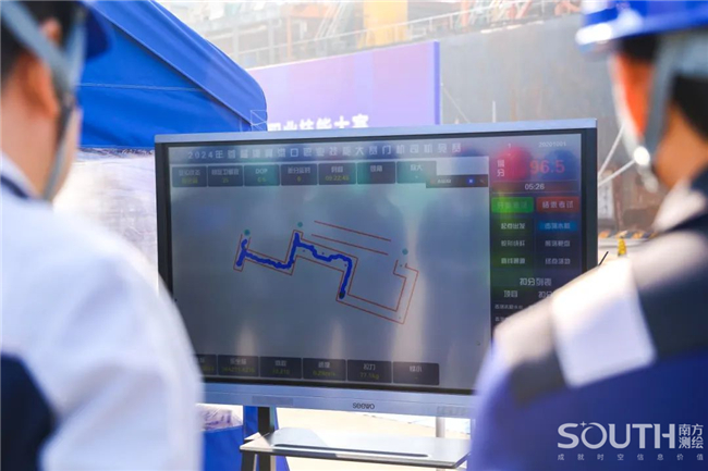 比賽期間,選手們爭分奪秒,熟練操作門機完成各項任務挑戰,以精湛的技藝和頑強的拼搏精神,展現了新時代技能人才的卓越風采。南方測繪北斗高精度電子裁判系統精準捕捉選手操作軌跡,將定位打靶、蛇形繞樁等計分要點可視化,助力比賽順利進行。