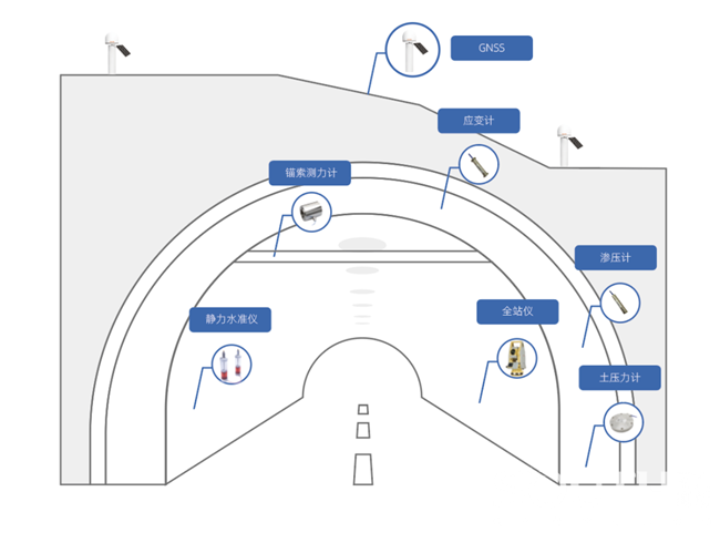 隧道輕量化監(jiān)測(cè)解決方案:針對(duì)圍巖沉降、拱頂變形、地表下沉進(jìn)行專項(xiàng)監(jiān)測(cè),實(shí)時(shí)采集隧道所處的靜態(tài)、動(dòng)態(tài)、環(huán)境等信息,為隧道安全預(yù)警、安全分析評(píng)估提供數(shù)據(jù)支持,及時(shí)了解結(jié)構(gòu)缺陷與損傷,并分析評(píng)估其可能發(fā)展勢(shì)態(tài)及其對(duì)結(jié)構(gòu)安全運(yùn)營(yíng)造成的潛在風(fēng)險(xiǎn)。