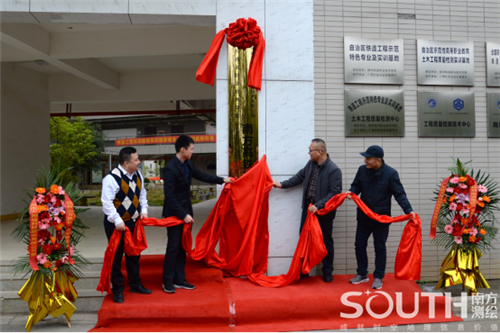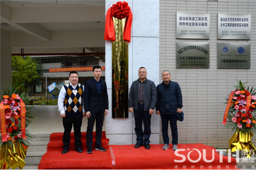最后,學(xué)校校長黃鋒、副校長楊楠和南方測繪集團(tuán)副總經(jīng)理馬然、南方高鐵總經(jīng)理朱茂棟共同為南方高鐵產(chǎn)業(yè)學(xué)院進(jìn)行了揭牌。