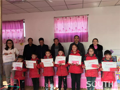 頒獎儀式在學校活動室進行,除南方測繪代表外,精準扶貧的駐村干部張世春、大南岔村村委會主任魏兆文、希望小學全體師生及部分學生家長都出席了活動,在短暫的說明后,劉利天給1位優秀教師和7位優秀學生頒發了南方測繪獎學金和證書。此次還給老師們贈送了南方測繪的定制背包和2020年的精美周歷。