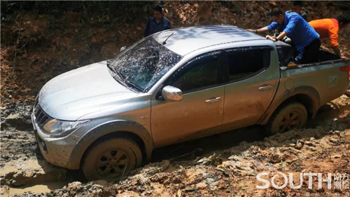 (道路崎嶇,皮卡車在濕滑泥路上多次爬坡失敗,最后用拖拉機(jī)強(qiáng)拉為其脫困)