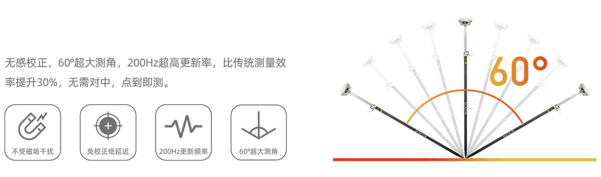 慣導傾斜測量 | 內置IMU慣性測量傳感器,支持慣導傾斜測量功能,根據對中桿傾斜方向和角度自動校正坐標 |