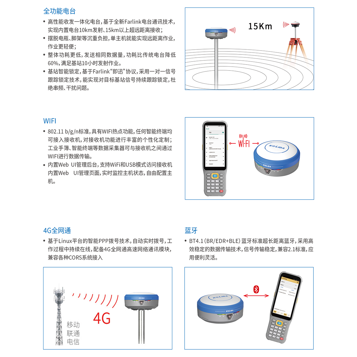 4G全網通 | 基于Linux平臺的智能PPP撥號技術,自動實時撥號,工作過程中持續在線,配備4G全網通高速網絡通訊模塊,兼容各種CORS系統接入 |