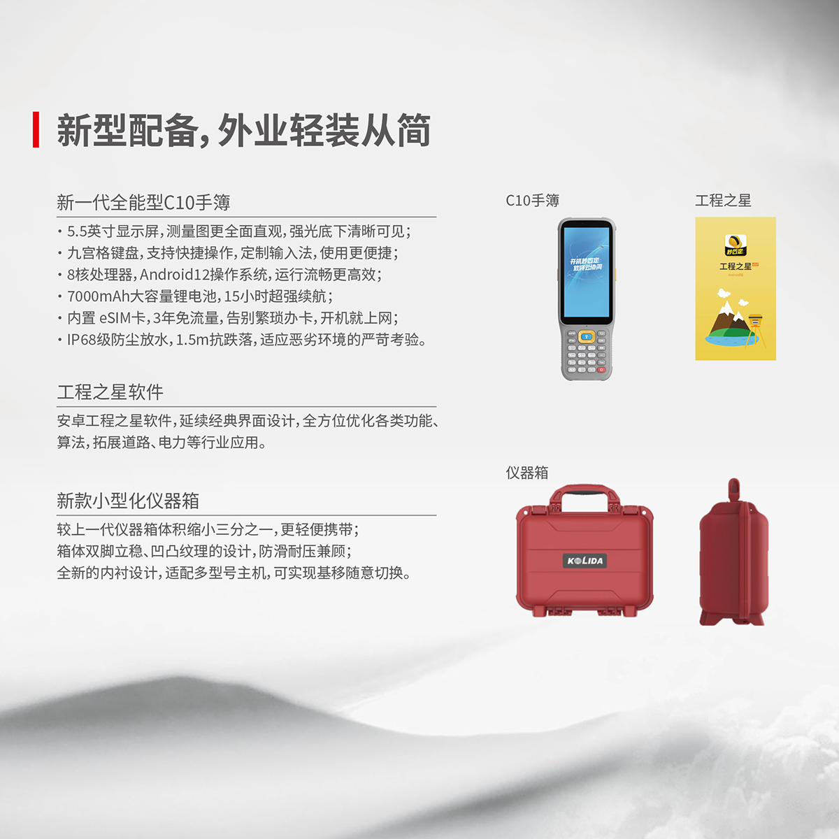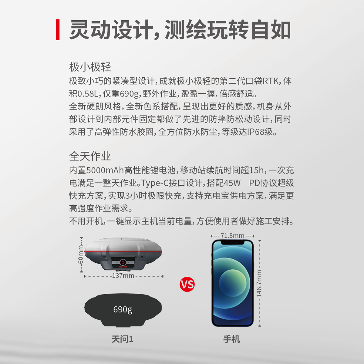 慣導傾斜測量 | 內置IMU慣性測量傳感器,支持慣導傾斜測量功能,根據對中桿傾斜方向和角度自動校正坐標。 |