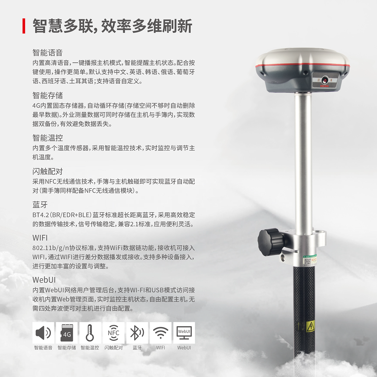 web交互 | 內置Web UI管理后臺,支持Wi-Fi和USB模式訪問接收機內置Web UI管理頁面,實時監控主機狀態,自由配置主機。 |